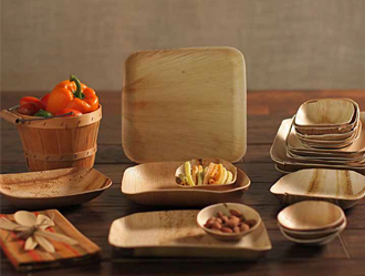 Los artículos de hoja de palma están hechos de los desechos que aparecen durante el proceso de crecimiento de las palmas de la India: hojas de palma que caen naturalmente. Estas hojas se limpian y se moldean en platos, bandejas y cuencos a altas temperaturas. Los artículos de hoja de palma tienen un sabor neutro y son resistentes al aceite, la humedad y la congelación.